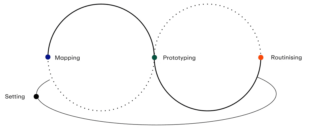 Setting – More than a one-time kick-off, Setting is an ongoing effort to ensure the right conditions for strategy work – shaping spaces, empowering people, and curating leadership. Together, we identify who forms the entrepreneurial core that drives strategy work across the organisation.